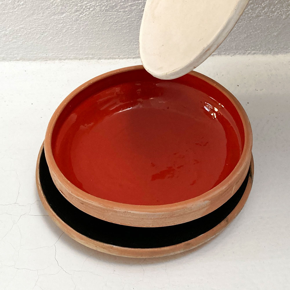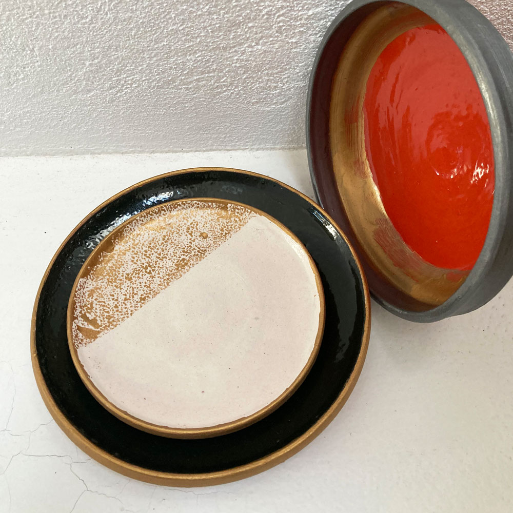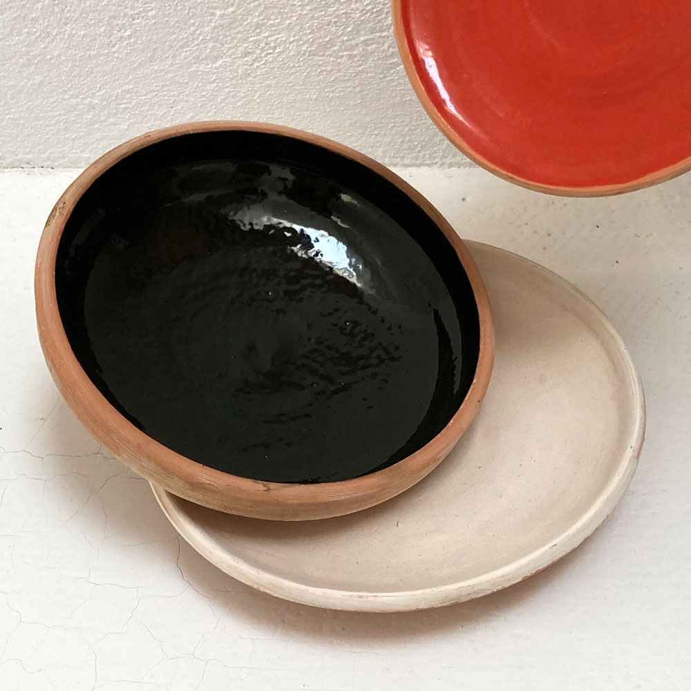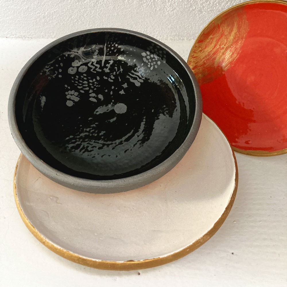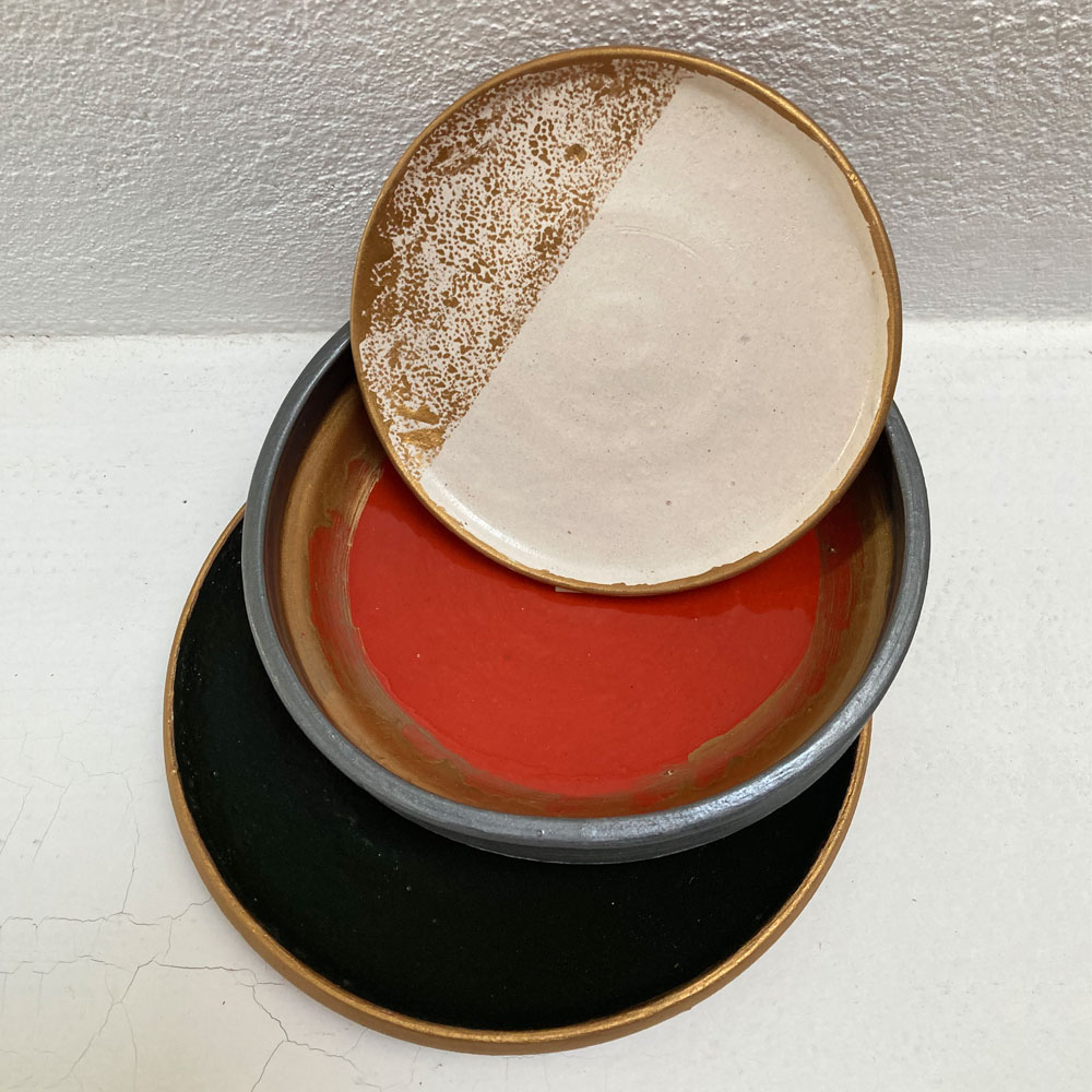 Farfurie mică, Φ 15 cm, farfurie mare, Φ 20 cm și bol, Φ 18 cm H 5 cm. Toate obiectele sunt din colecția ROUGH, din lut modelat pe roata olarului în Horezu, glazurate cu glazuri tradiționale, și vor fi fiecare din câte o culoare, alb, roșu și negru-verde-foarte-inchis. Fiecare set include o culoare pentru decorat, auriu sau argintiu*, și o pensulă.